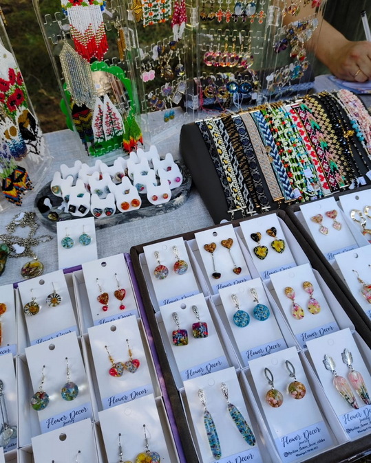 Полина Драгун привезет украшения из бисера — серьги, колье, броши, браслеты. Мастер также владеет искусством сохранять красоту цветов, листьев, грибов. Она сушит их особым образом. Заливает эпоксидной смолой и создает удивительной красоты серьги и кулоны. Также мастерица шьет тюбетейки и трендовые ободки-кокошники из бархатной ткани.