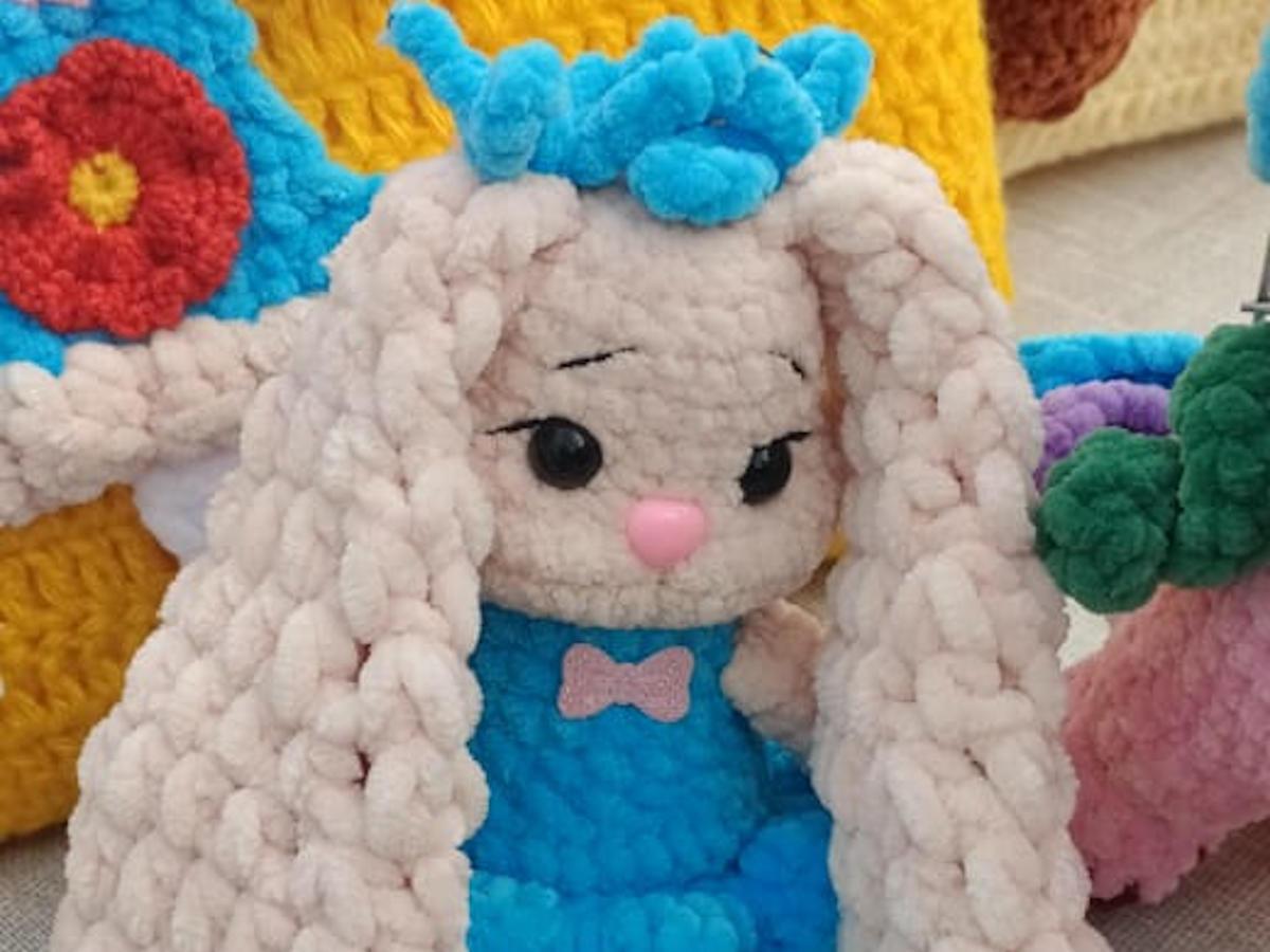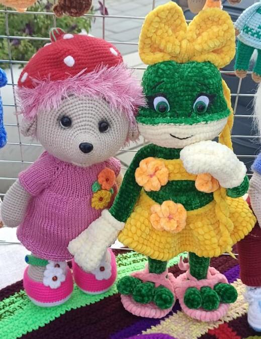 Можно будет увидеть на выставке также вязанные крючком яркие работы Надежды Коротиной — сумки, брелки, подушки, игрушки.