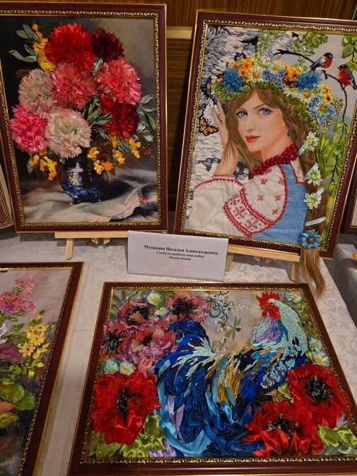 Удивят зрителей и чудесные картины, вышитые атласными лентами, которые мастерит Наталья Мусихина. Уже пять лет Наталья Александровна создает не только картины, но и настенные часы в этой технике, также вышивает крестиком, гладью и бисером. Уникальный мастер в своем роде.