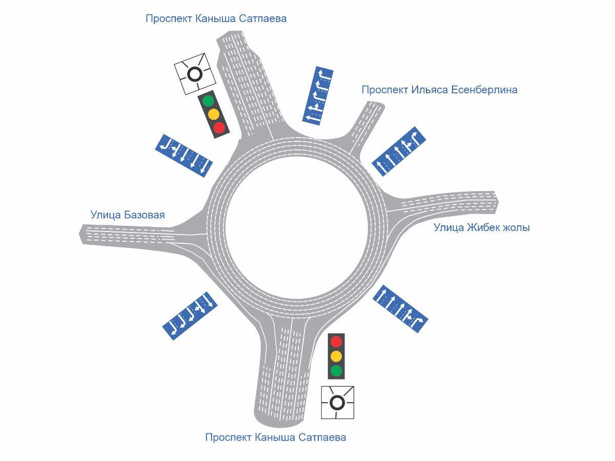 Скорость движения по кольцу ограничена 30 километрами в час. На проспекте Сатпаева установлены светофоры. Они будут работать только в час пик.